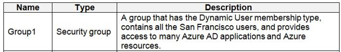 https://docs.microsoft.com/en-us/azure/active-directory/users-groupsroles/groups-dynamic-membershipScenario:Litware identifies the following identity and access requirements: All San Francisco users and their devices must be members of Group1.The tenant currently contain this group:   References:https://docs.microsoft.com/en-us/azure/active-directory/users-groups-roles/groups- dynamic-membershiphttps://docs.microsoft.com/en-us/azure/active-directory/fundamentals/active-directorygroups-create-azure-portal