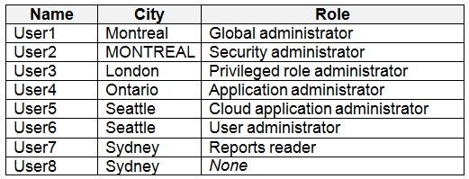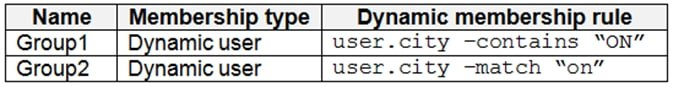 Box 1: User1, User2, User3, User4Contains "ON" is true for Montreal (User1), MONTREAL (User2), London (User 3), and Ontario (User4) as string and regex operations are not case sensitive.Box 2: Only User3 -Match "*on" is only true for London (User3) as 'London' is the only word that ends with 'on'.Scenario:Contoso.com contains the users shown in the following table. Contoso.com contains the security groups shown in the following table. References:https://docs.microsoft.com/en-us/azure/active-directory/users-groups-roles/groups-dynamic-membership
