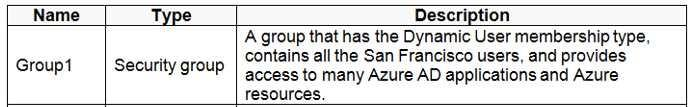 https://learnpros.net/Scenario:Litware identifies the following identity and access requirements: All San Francisco users and their devices must be members of Group1.The tenant currently contain this group:       References:https://learnpros.net/