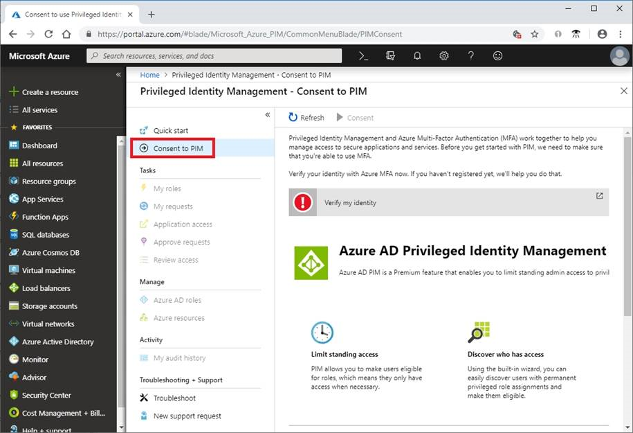 Step 1: Consent to PIM  Step: 2 Verify your identity by using multi-factor authentication (MFA)Click Verify my identity to verify your identity with Azure MFA. You'll be asked to pick an account. Step 3: Sign up PIM for Azure AD rolesOnce you have enabled PIM for your directory, you'll need to sign up PIM to manage Azure AD roles. References:https://docs.microsoft.com/en-us/azure/active-directory/privileged-identity-management/pim-getting-started