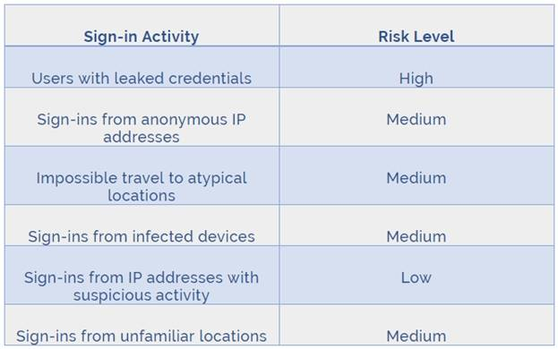Azure AD Identity protection can detect six types of suspicious sign-in activities:Users with leaked credentials Sign-ins from anonymous IP addresses Impossible travel to atypical locations Sign-ins from infected devices Sign-ins from IP addresses with suspicious activity Sign-ins from unfamiliar locations These six types of events are categorized in to 3 levels of risks – High, Medium & Low:  References:http://www.rebeladmin.com/2018/09/step-step-guide-configure-risk-based-azure-conditional-access-policies/
