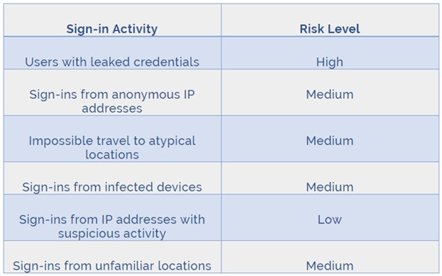 Azure AD Identity protection can detect six types of suspicious sign-in activities:Users with leaked credentials Sign-ins from anonymous IP addresses Impossible travel to atypical locations Sign-ins from infected devices Sign-ins from IP addresses with suspicious activity Sign-ins from unfamiliar locations These six types of events are categorized in to 3 levels of risks – High, Medium & Low:    References:http://www.rebeladmin.com/2018/09/step-step-guide-configure-risk-based-azure-conditional-access-policies/
