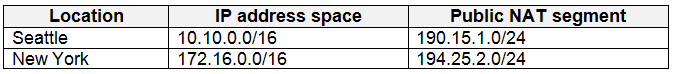 Your company has two offices in Seattle and New York. Each office connects to the Internet by using a NAT device. The offices use the IP addresses shown in the following table.