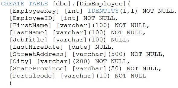 Scenario: Implement a surrogate key to account for changes to the retail store addresses. A surrogate key on a table is a column with a unique identifier for each row. The key is not generated from the table data. Data modelers like to create surrogate keys on their tables when they design data warehouse models. You can use the IDENTITY property to achieve this goal simply and effectively without affecting load performance.  Reference: https://docs.microsoft.com/en-us/azure/synapse-analytics/sql-data-warehouse/sql-data-warehouse-tables-identity