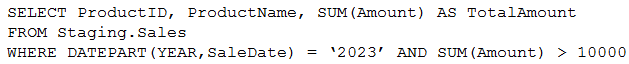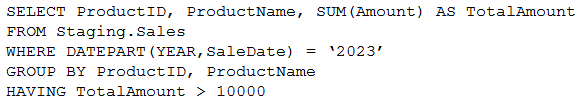 You need to write a T-SQL query that will return data for the year 2023 that displays ProductID and ProductName and has a summarized Amount that is higher than 10,000.