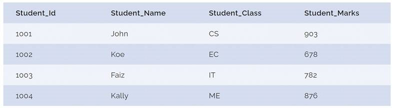For example, a table STUDENT_RECORD represents the record of students in a class and the attributes of columns are - Student_Id, Student_Name, Student_Branch, and Student_Marks. We need to define the data type of each attribute in the beginning at the time of the creation of the table. Here, if we set Student_Id as a number, all the values in the column Student_Id will contain numbers only. And if we set it as alphanumeric, all the values in the column Student_Id will contain both alphabets and numbers.