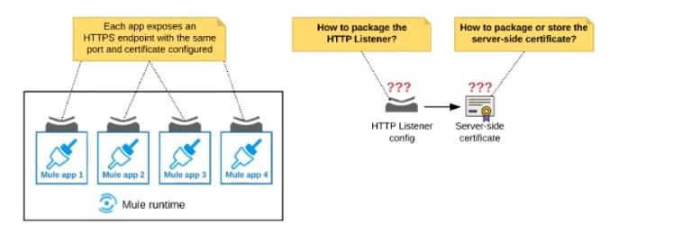 Correct answer is Package the HTTPS Listener configuration in a Mule DOMAIN project, referencing it from all Mule applications that need to expose an HTTPS endpoint. Store the server-side certificate in a shared filesystem location in the Mule runtime's classpath, OUTSIDE the Mule DOMAIN or any Mule APPLICATION.