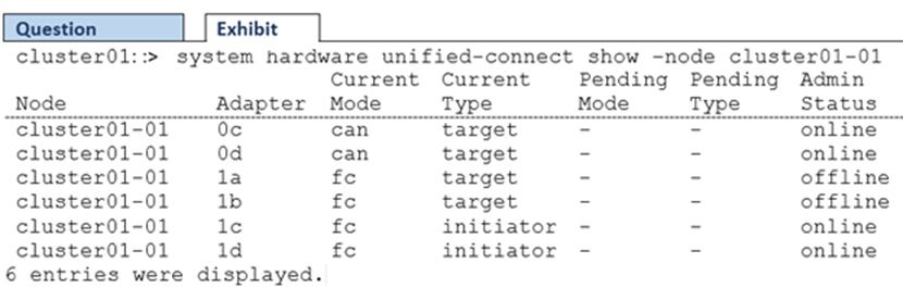 Referring to the exhibit, which two pairs of ports are currently configurable as FC SAN LIFs? (Choose two.)