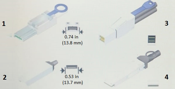 Observation: Connector 1 in the exhibit is labeled as 0.74 in (13.8 mm), which matches the size and appearance of an InfiniBand 4X connector.
