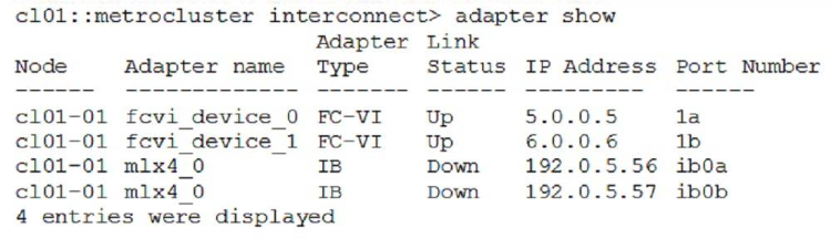 Your customer is calling about their MetroCluster environment. They have provided you with the output of the metrocluster interconnect adapter show command.