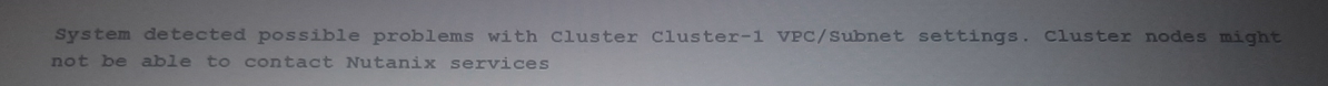 The alert indicates a potential issue with the VPC/Subnet settings, preventing the cluster nodes from contacting Nutanix services.