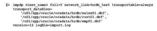 Examine the following impdp command to import a database over the network from a pre-12c Oracle database (source):