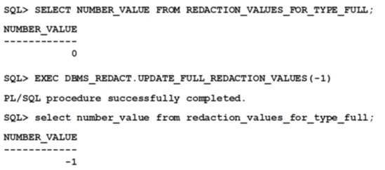 About Altering the Default Full Data Redaction Value You can alter the default displayed values for full Data Redaction polices. By default, 0 is the redacted value when Oracle Database performs full redaction (DBMS_REDACT.FULL) on a column of the NUMBER data type. If you want to change it to another value (for example, 7), then you can run the DBMS_REDACT.UPDATE_FULL_REDACTION_VALUES procedure to modify this value. The modification applies to all of the Data Redaction policies in the current database instance. After you modify a value, you must restart the database for it to take effect. Note:* The DBMS_REDACT package provides an interface to Oracle Data Redaction, which enables you to mask (redact) data that is returned from queries issued by low-privileged users or an application. * UPDATE_FULL_REDACTION_VALUES Procedure This procedure modifies the default displayed values for a Data Redaction policy for full redaction. * After you create the Data Redaction policy, it is automatically enabled and ready to redact data. * Oracle Data Redaction enables you to mask (redact) data that is returned from queries issued by low-privileged users or applications. You can redact column data by using one of the following methods:/ Full redaction. / Partial redaction. / Regular expressions. / Random redaction. / No redaction.