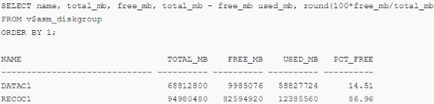 The example above shows that the DATAC1 disk group has only about 15% of free space available while the RECOC1 disk group has about 87% free disk space. The PCT_FREE displayed here is raw free space, not usable free space. Additional space is needed for rebalancing operations.