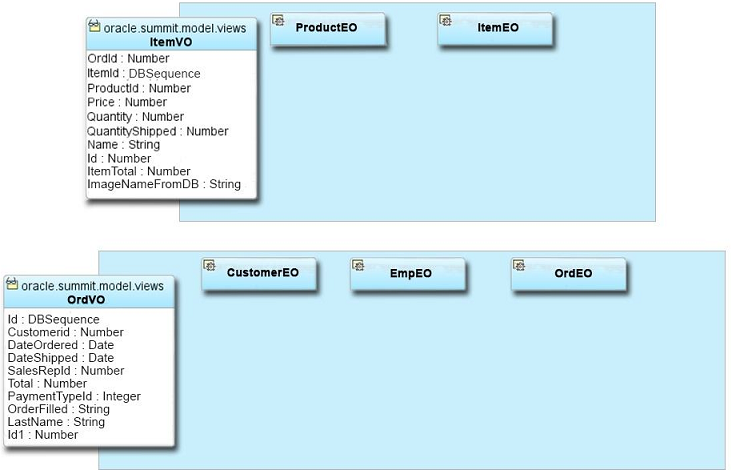 2. Create a view link with OrdVO as the source and ItemVO as the destination and define the linked attributes. Use the Application Module Editor to define the data model for the hierarchy.