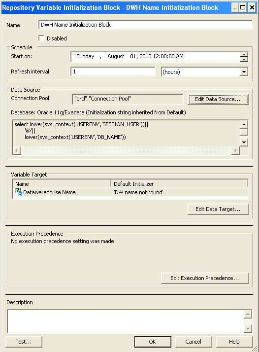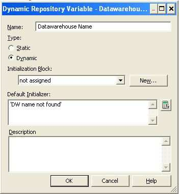 CurrentMonth can be calculated by a sql statement. Note:REPOSITORY VARIABLE(DYNAMIC) Initialized when BI server is started Assigned value dynamically based on the result of a query Value is dependent of the sql provided in Initialization Block Create a dynamic variable and provide a Name and Default Initializer.Create a new initialization block by clicking on the New button in the above screen.   Provide Intialization Block variable Name   Click on “Edit Data Source” button and provide the sql to be used for the variable, e.g. select lower(sys_context('USERENV','SESSION_USER'))||        '@'||        lower(sys_context('USERENV','DB_NAME'))   from dual;
