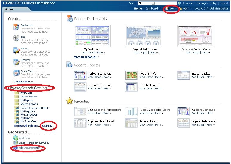 Note: The BI Home page contains the BI content catalog. Fusion Apps will use OBIEE web catalog to store all shipped reporting and analytics content.