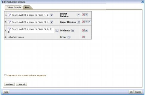 The “Edit Column Formula” dialog box has a second, very tiny tab called, “Bins.”  You can use this tab to have OBIEE build a CASE statement for you in a formula (you can also create a CASE statement yourself by using one of the functions that appears under “Expressions” if you want).  A CASE statement is a lot like an IF-THEN-ELSE statement, except that it’s a little easier to read when you have multiple options.  Basically, it puts values in different buckets that you define. Note:Figure:  Incorrect answers:C: The “Conditional Format” tab lets you set formatting when specific conditions are met.