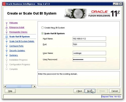 B: If you want to scale out this infrastructure, you would typically run the OBIEE 11g installer on a second server, and instead of choosing to do a new install, you’d choose to instead scale out the existing BI domain.