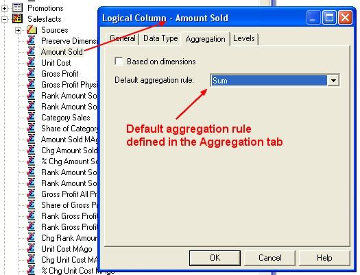 Note 2: A measure column is a column unlike the baseline column that has a default aggregation rule defined in the Aggregation tab of the Logical Column dialog in the repository.