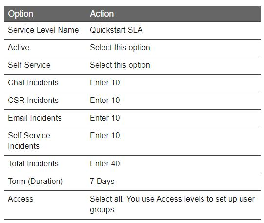 Service Level Agreements (SLA) determine control the type and amount of support you offer your customers. You must define an SLA to associate with Customer Portal users. Table Service Level Agreement Options, Example   References:https://docs.oracle.com/cloud/august2016/servicecs_gs/FAKAU/Chunk858056443_d105.htm