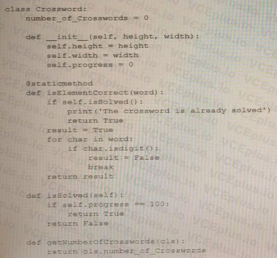 The correct answer is B. The getNumberofCrosswords() method should be decorated with @classmethod. In the given code snippet, the getNumberofCrosswords method is intended to be a class method that returns the value of the numberofcrosswords class variable. However, the method is not decorated with the @classmethod decorator and does not take a cls parameter representing the class itself. To make getNumberofCrosswords a proper class method, it should be decorated with @classmethod and take a cls parameter as its first argument.