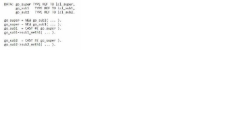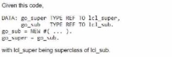 C: This statement is incorrect. go_sub2 = CAST #(go_super) will work. go_sub2->sub2_meth1(...) will not work. This is because go_sub2 is a data object of type REF TO cl_sub2, which is a reference to the subclass cl_sub2. go_super is a data object of type REF TO cl_super, which is a reference to the superclass cl_super. The CAST operator is used to perform a downcast or an upcast of a reference variable to another reference variable of a compatible type. A downcast is a conversion from a more general type to a more specific type, while an upcast is a conversion from a more specific type to a more general type. In this case, the CAST operator is trying to perform a downcast from go_super to go_sub2, and this is possible, as go_super is pointing to an instance of cl_sub2, which is a subclass of cl_super. Therefore, the CAST operator will assign the reference of go_super to go_sub2 without raising an exception. However, the method call go_sub2->sub2_meth1(...) will not work, as sub2_meth1 is a subclass-specific method of cl_sub2, which is not inherited by cl_super.Therefore, the method call will raise an exception CX_SY_DYN_CALL_ILLEGAL_METHOD at runtime123
