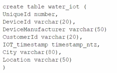 A clustering key is a subset of columns or expressions that are used to co-locate the data in the same micro-partitions, which are the units of storage in Snowflake. Clustering can improve the performance of queries that filter on the clustering key columns, as it reduces the amount of data that needs to be scanned. The best choice for a clustering key depends on the query patterns and the data distribution in the table. In this case, the columns DeviceId, IOT_timestamp, and CustomerId are frequently used in the filter predicate for the select statement, which means they are good candidates for the clustering key. The columns City and DeviceManufacturer are often retrieved, but not filtered on, so they are not as important for the clustering key. The column UniqueId is used for counting, but it is not a good choice for the clustering key, as it is likely to have a high cardinality and a uniform distribution, which means it will not help to co-locate the data. Therefore, the best option is to use DeviceId and CustomerId as the clustering key, as they can help to prune the micro-partitions and speed up the queries.Reference:Clustering Keys & Clustered Tables,Micro-partitions & Data Clustering,A Complete Guide to Snowflake Clustering