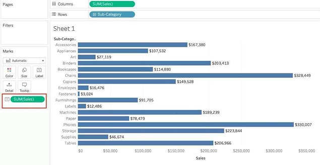 When you add a measure to the view, Tableau automatically aggregates its values. Sum, average, and median are common aggregations; for a complete list, see List of Predefined Aggregations in Tableau.