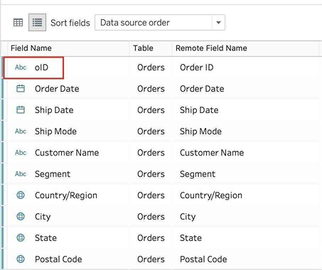 Now, we'll see oID when using this data source in Tableau. This WILL NOT affect the original data source. The remote field name let's us see what the name of the column is in the ORIGINAL Data source.