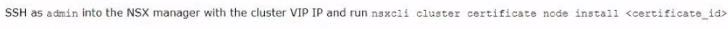 SSH as admin into the NSX manager with the cluster VIP and run nsxcli cluster certificate vip install certificate_id=<certificate_id>Send an API call to https://<nsx_mgr_vip>/api/2.0/services/trustmanagement/cluster_certificate/install?cluster_certificate_id=<certificate_id>These steps are consistent with the VMware NSX Documentation, which states that you need to install the SSL certificate for the cluster VIP on both the NSX Manager node and the cluster using the nsxcli command and the API call respectively.