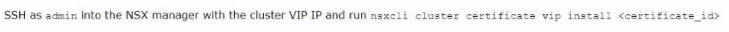 An administrator has been tasked with Implementing the SSL certificates for the NSX Manager Cluster VIP. Which Is the correct way to implement this change?